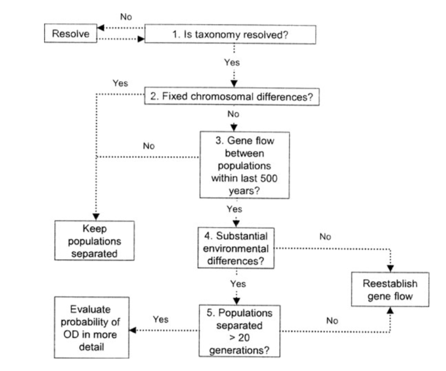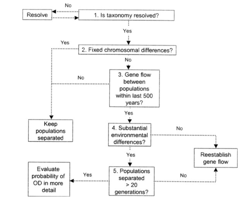 Une augmentation du flux de gènes entre des espèces différentes n'est pas recommandée, car les risques de dépression hybride sont élevés. De même, si les populations présentent différents caryotypes ou si elles sont isolées depuis 500 ans ou plus, ces dernières doivent rester séparées. Concernant les conditions environnementales, si celles-ci sont différentes, il est nécessaire de déterminer le nombre de générations au cours desquelles les populations se sont adaptées à leur environnement. Au dessus de 20 générations, la probabilité de dépression hybride doit être évaluée avec plus de détails.