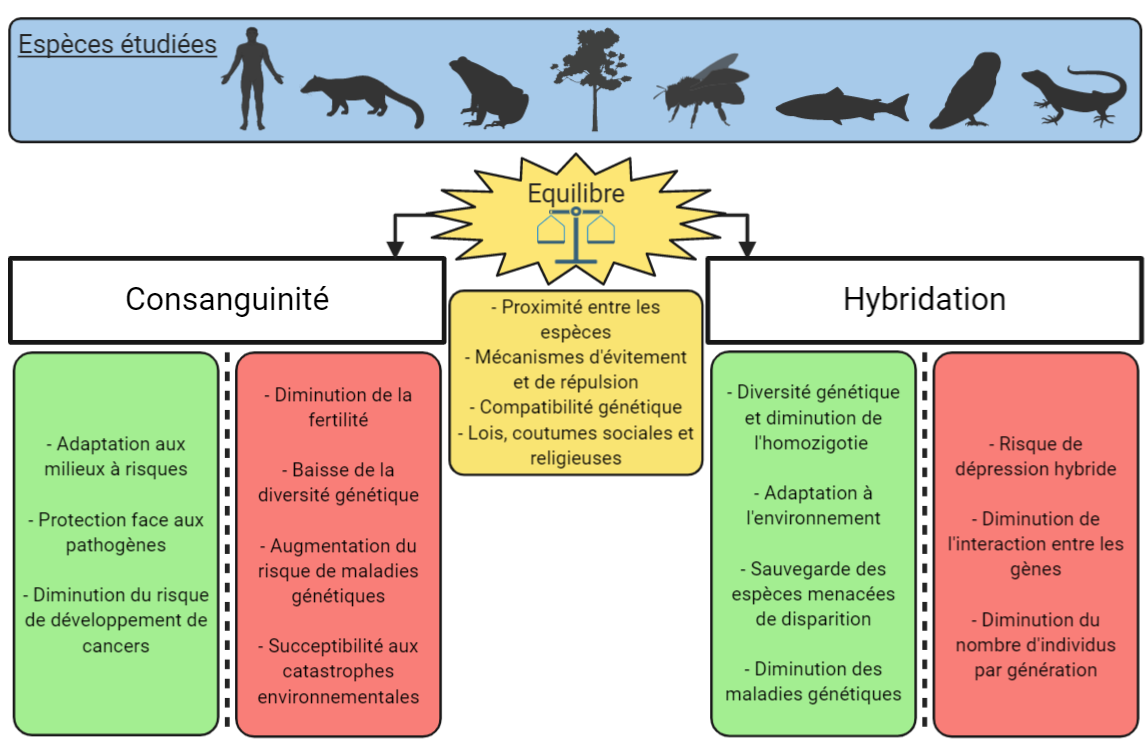 Cadre de l'étude : Dans cette étude, les effets de ces deux phénomènes sur divers être vivants (humain et autres animaux) seront exposés. Cette synthèse repose sur des articles traitants de plusieurs espèces et du monde entier afin d'avoir un aperçu large et une vision globale des effets de la consanguinité et de la dépression hybride.