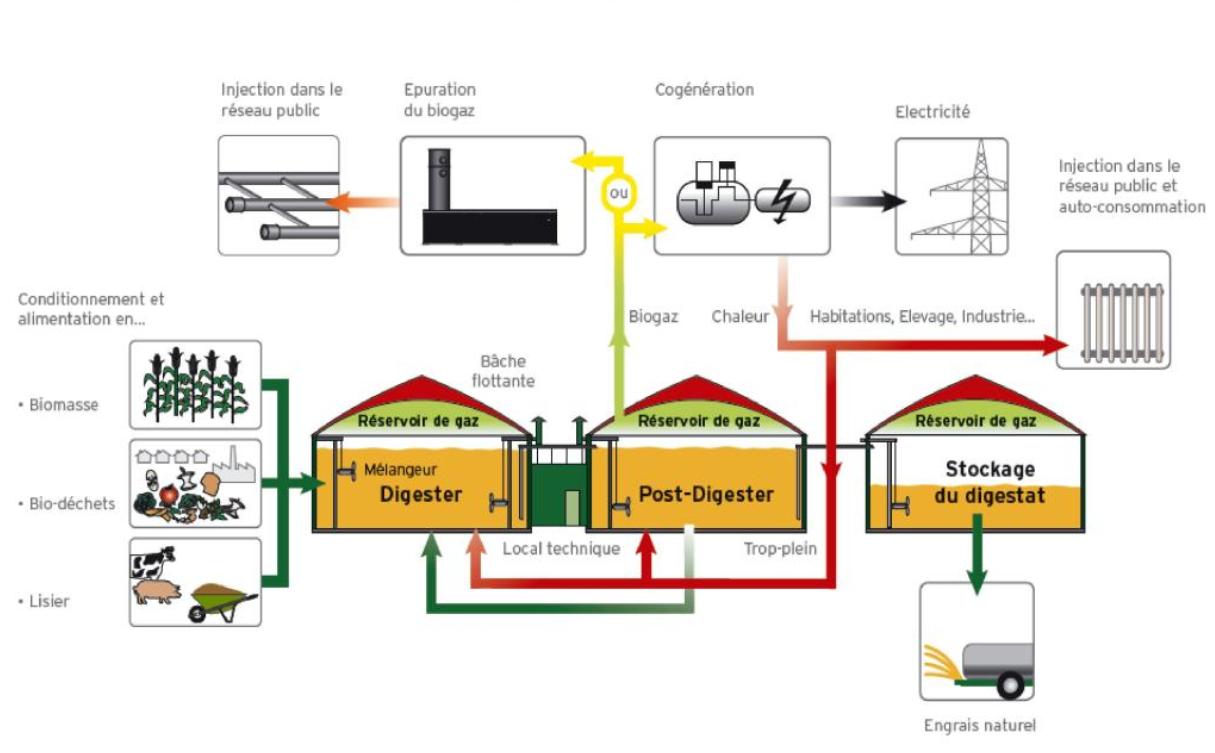 Le biogaz est le résultat de la digestion anaérobie des matières organiques. Le gaz combustible produit est utilisé afin de produire de l'électricité, de la chaleur ou du biocarburant. Il est issu de la valorisation de sous-produits de l’industrie agro-alimentaire, boues des stations d’épurations (STEP), lisiers, animaux ou déchets agricoles par un processus de méthanisation industrielle.