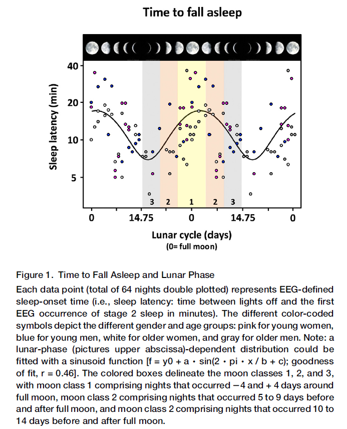 En parallèle et toujours en 2014, Turányi et al.[6] ont publié une analyse rétrospective sur 319 participants suspectés de souffrir de troubles du sommeil. Ils ont trouvés qu’ils dormaient moins bien les soirs autours de la pleine lune, comme Cajochen et al. et Smith et al. mais, contrairement à ce dernier groupe, que ce sont les femmes qui sont les plus affectées.