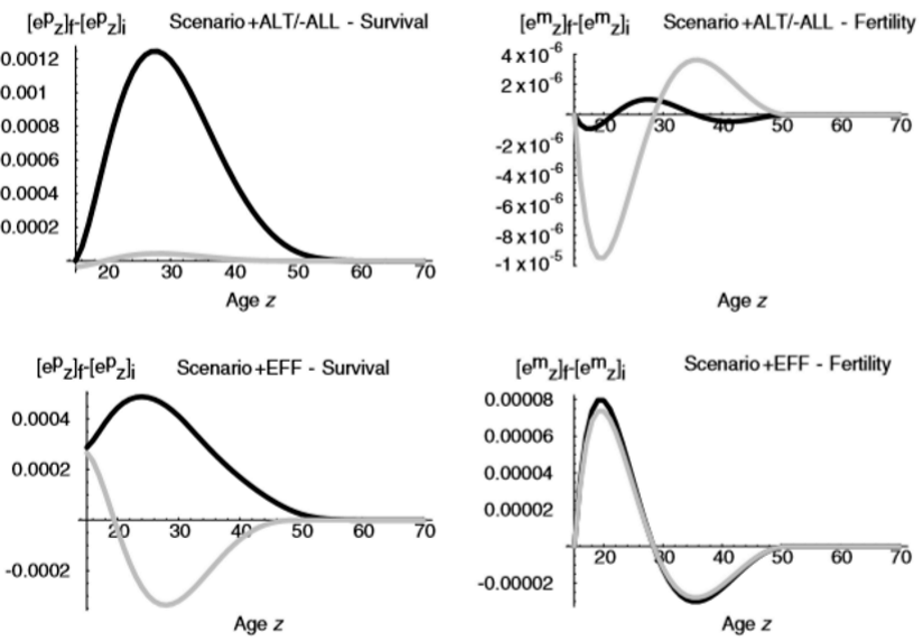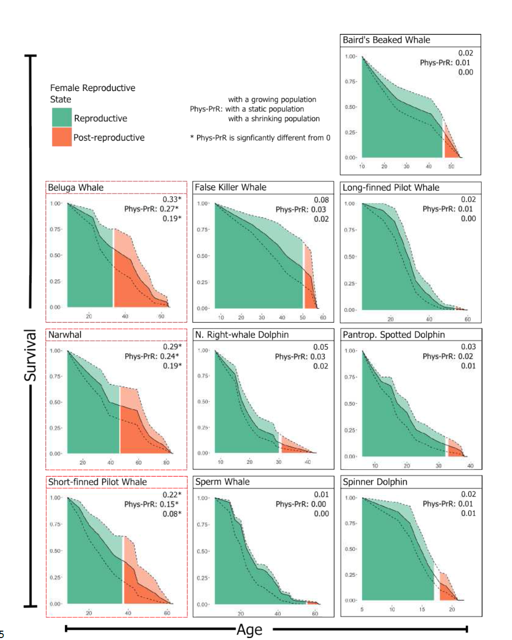 De plus, le taux de mortalité des petits de femelles âgées est presque deux fois plus important que celui de leurs filles lorsque les deux générations se reproduisent au même moment[5]. L'importance de la durée de vie post-reproductive des orques est liée aux soins parentaux prodigués à la progéniture, surtout aux mâles âgés[1]. La mise en évidence de la baisse de fitness et de survie des individus après la mort des mères post-reproductrices vient renforcer la théorie adaptative. La sélection naturelle semble favoriser les jeunes femelles en âge de se reproduire. Chez l'Homme, s’il reste dur de vérifier le potentiel lien entre allongement de la durée de vie post ménopause, plus grande production de petits-enfants et meilleure fitness, la durée de vie post-reproductive d’une femme a un effet positif sur le nombre de descendants qu’elle engendre. Les bienfaits pour la fitness d'une prolongation de l'espérance de vie baissent avec le rendement reproducteur de la progéniture, appuyant de fait la théorie adaptative[6].