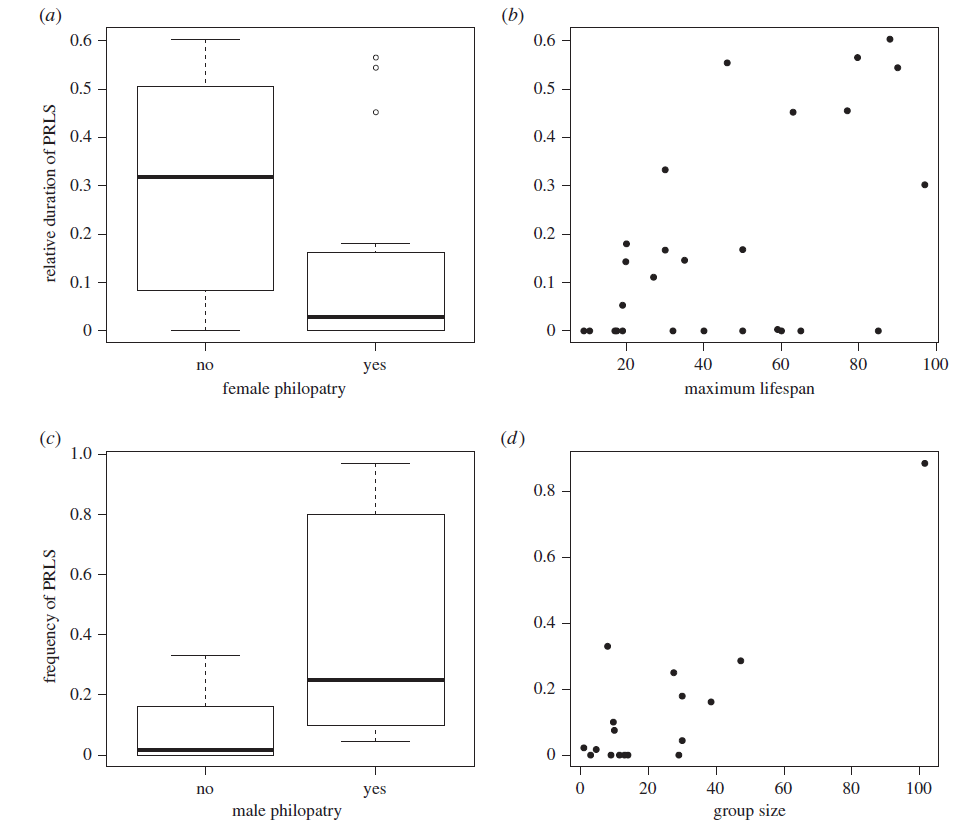 Pour certains, même si les femelles âgées améliorent la fitness de leur descendance, la ménopause est un phénomène biologique restreint à peu d’espèces du fait de l’existence de modèles sociaux particuliers qui explique le maintien de ce trait rare. Chez les cétacés, il s’agirait d’ailleurs d’une homoplasie phylogénétique apparue plusieurs fois indépendamment[14]. Chez nombre de mammifères sociaux, les femelles connaissent un déclin de la parenté locale avec l'âge, mais les deux arrangements sociaux inhabituels caractérisant les espèces ménopausées (femmes biaisant la dispersion et accouplement local pour l'Homme, philopatrie et accouplement hors groupe pour l'orque) donnent lieu à une hausse de ce lien avec l'âge des femelles. Ainsi, Homo et odontocètes sont à terme prédisposés à l'évolution de la ménopause et au comportement altruiste[3]. Mais s’il semble exister un lien significatif entre philopatrie des mâles et longue durée de vie post-reproductive, la ménopause aurait évolué avant la philopatrie, fragilisant cette théorie[15].