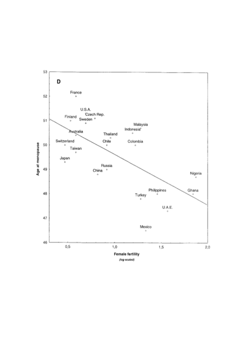 Mais la période post-ménopausique a déjà été caractérisée à l’état ancestral, pouvant atteindre 20 ans chez les femmes humaines. Le progrès ne suffit donc pas à expliquer l’existence d’une espérance de vie post période procréative[12]. Et si tel n’avait pas été le cas, on aurait pu s’attendre à ce que la fertilité féminine évolue avec l’espérance de vie humaine, à l’instar de ce que l’on observe chez les mâles. Enfin, la sélection d'une durée de vie post-reproductive chez les femmes humaines peut être le résultat d'une interaction dynamique entre la nécessité de soins prolongés des petits, un compromis physiologique favorisant une fécondité aisée et une hausse de durée et d'espérance de vie, tardive chez le genre Homo[7].