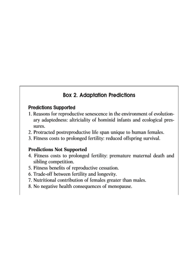 Si un arrêt de la reproduction existe chez nombre de mammifères, celui-ci est souvent proche de la mort des individus. Mais une longue durée de vie post reproductive fait suite à la ménopause chez certaines espèces. Pourtant, la reproduction se maintient dans l’évolution des espèces car elle est nécessaire à leur survie et à l’apparition des générations suivantes : il ne devrait pas y avoir sélection d’individus infertiles. Deux grands points de vue tentent d'expliquer la prolongation de la durée de vie post-reproductive[1] : un épiphénomène de longévité accrue sans bénéfice pour la fitness, sorte de compromis physiologique favorisant une reproduction efficace en début de vie fertile, ou une adaptation évolutive facilitant un plus fort investissement dans la progéniture existante.