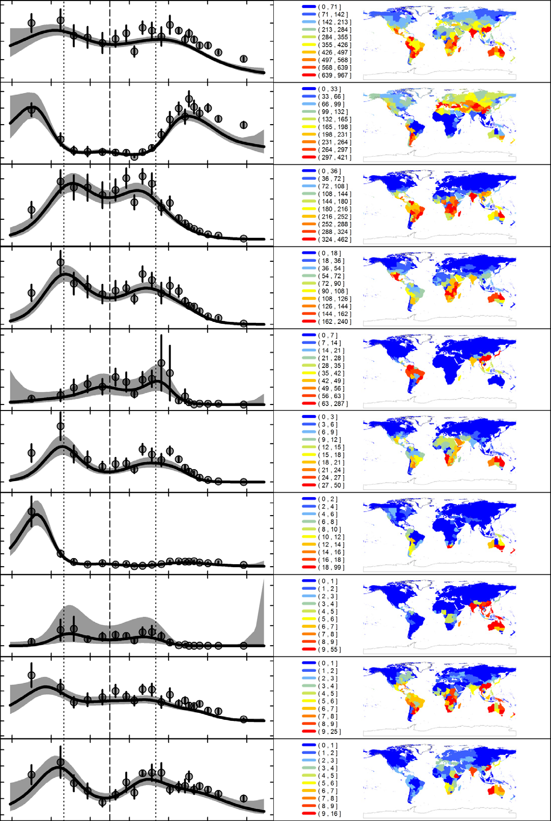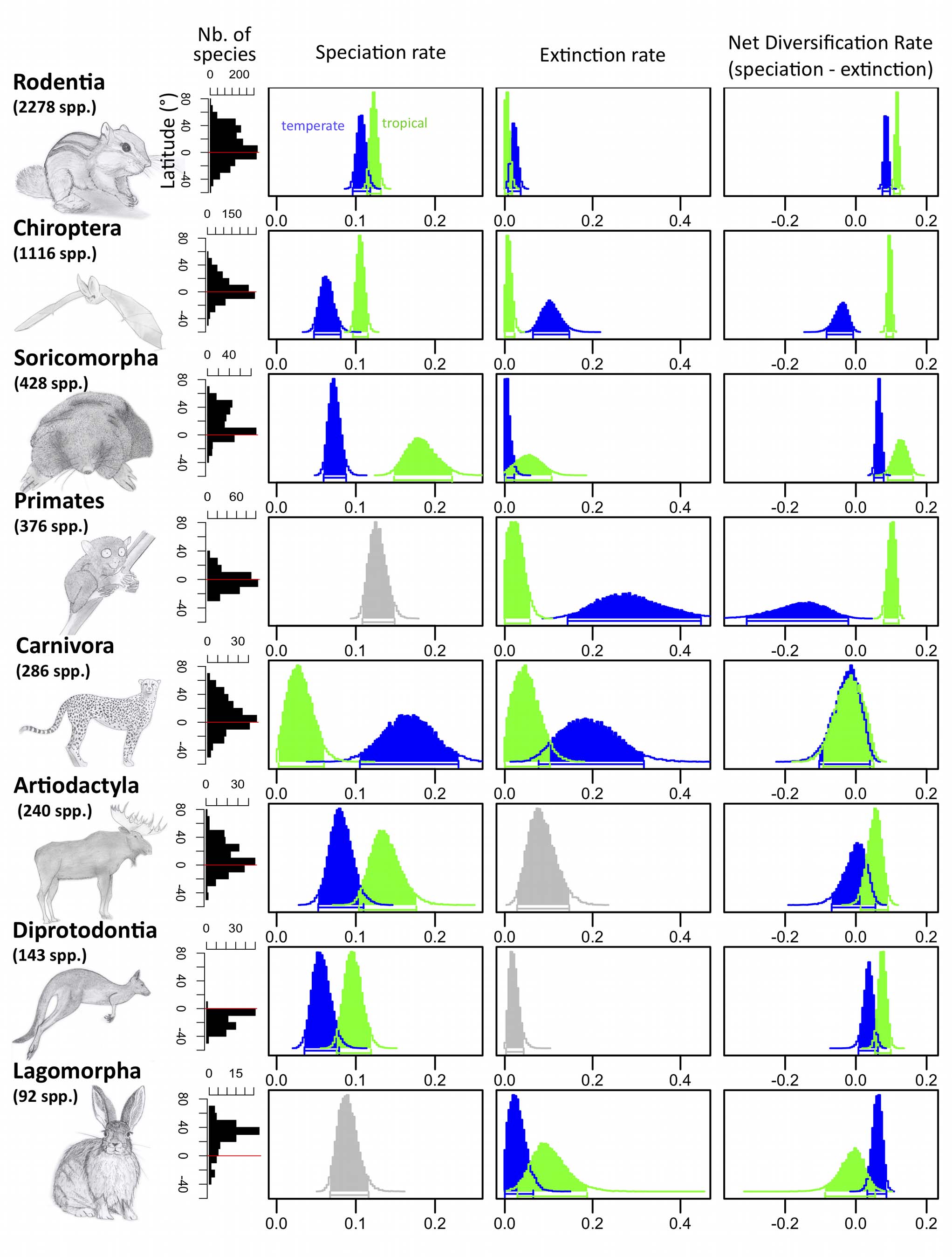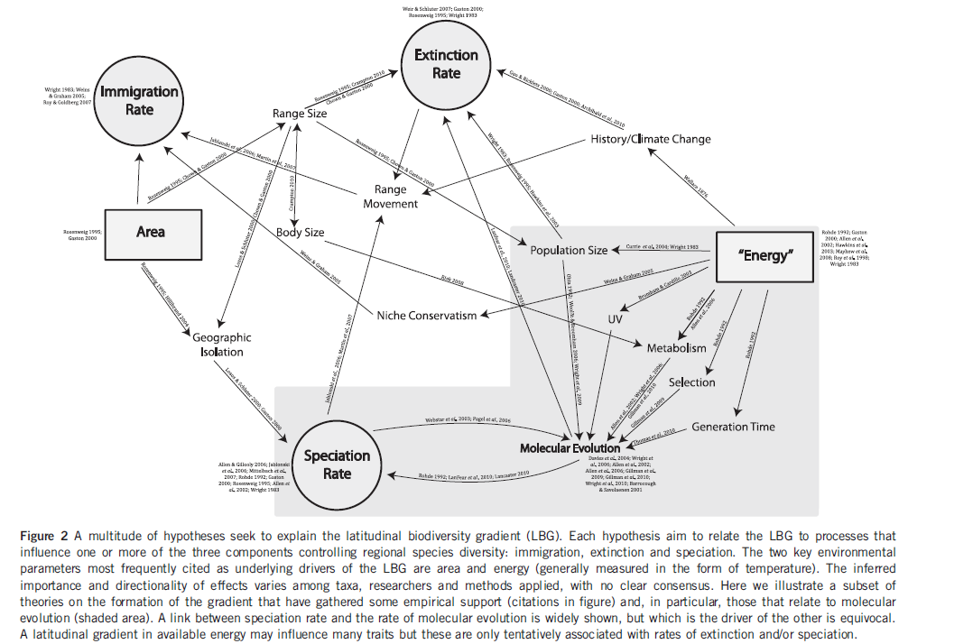 Ces facteurs vont ainsi impacter de nombreux phénomènes écologiques et évolutifs, eux-mêmes responsables des différentiels de distribution spatiale de la biodiversité. On peut ainsi mettre en lumière les phénomènes de conservation des niches écologiques (Fernandez et al, 2016), de dispersion et de migration (Böhm et al, 2005; Rolland et al, 2015), d’exclusion compétitive et d’agrégation des niches écologiques (Siqueira et al, 2016), de diversification (taux d’extinction et de spéciation) (Visser et al, 2013; Rolland et al, 2014; Andam et al, 2016) ou encore d’augmentation de taux d’évolution moléculaire (Wright et al, 2006) dans la formation d’un gradient latitudinal de diversité.