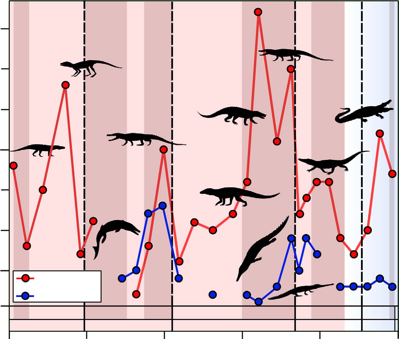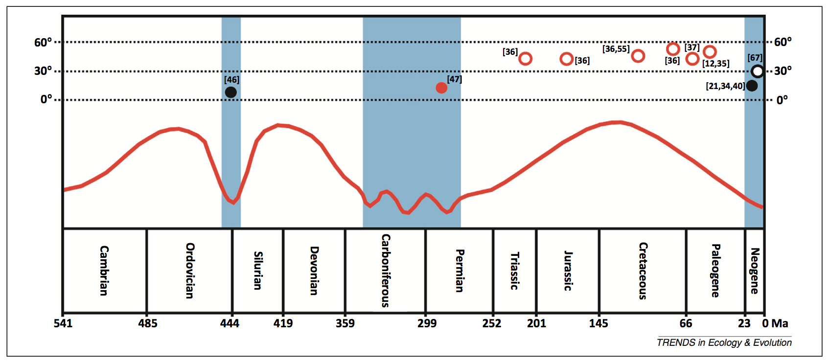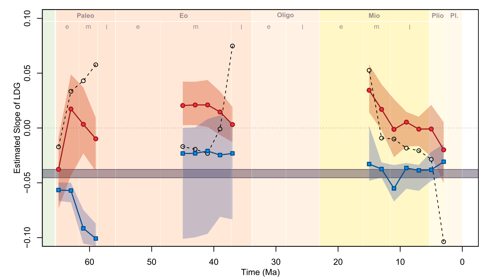 Cependant, les critiques les plus virulentes concernant l’universalité du gradient latitudinal de diversité ne viennent pas des données néontologiques mais des données paléontologiques. En effet, des études approfondies des données d’occurrences spatiales et temporelles de divers taxa fossiles ont permis de démontrer le caractère ponctuel du GLD dans le temps long (Mannion et al, 2014; Mannion et al, 2015; Marcot et al, 2016; Rolland et al, 2015). La formation d’un tel gradient semble ainsi faire écho à des périodes de chute globale des temperatures, mettant ainsi en exergue l’importance du facteur climatique. Cependant, le rôle des facteurs géographiques et historiques n’est pas à négliger (Böhm et al, 2005; Condamine et al, 2012). Enfin, il est important de mettre en lumière les différences de comportement des faunes marines et terrestres vis à vis d’une distribution latitudinale de la biodiversité (Mannion, 2014; Mannion, 2015).