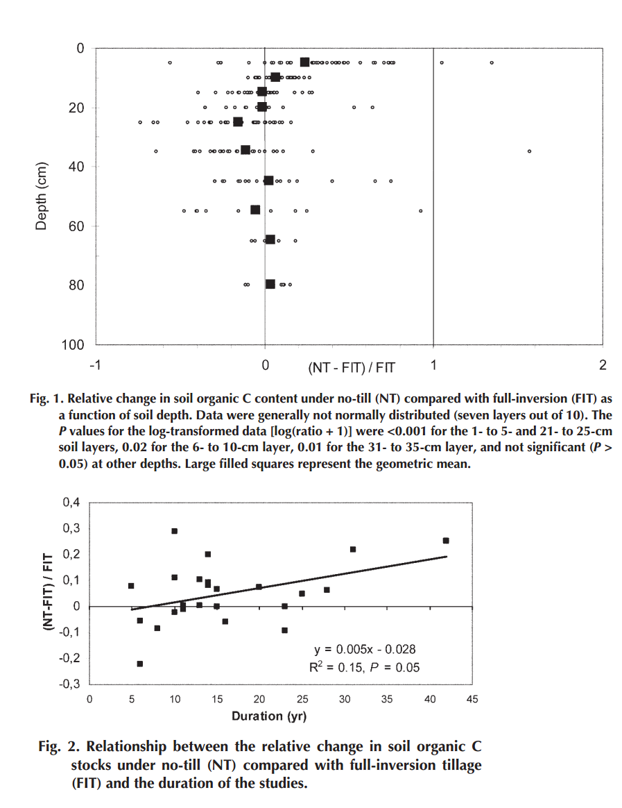 Il s'avère en fait que même si la teneur en carbone augmente bel et bien dans les premiers horizons du sol, le non-labour a tendance à appauvrir les horizons plus profonds[2]. Cela explique la sur-estimation initiale du stockage de carbone, les premières études n'ayant considéré que des horizons superficiels. Plutôt qu'un stockage, le non-labour entraîne donc davantage une redistribution verticale du carbone dans le sol.