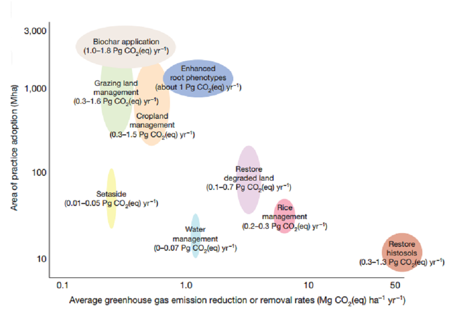 Cependant, certaines études tendent à montrer le contraire, voire même un déstockage du carbone du sol ! La question du stockage du carbone est d'autant plus cruciale quand on se met dans la perspective d'une lutte contre le changement climatique. Par exemple, le Ministère de l'Agriculture en France a lancé un programme appelé "4 pour mille" destiné à augmenter le stock de carbone dans le sol pour combattre le changement climatique. Son nom vient d'un ordre de grandeur courant rappelant qu'une augmentation de 4 pour mille du stock de carbone dans les sols du monde équivaudrait à stocker une année d'émission de gaz à effet de serre.