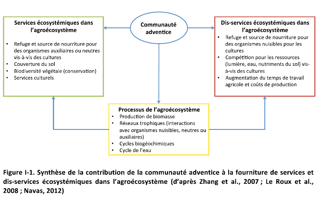 Toutefois, aujourd'hui plusieurs études mettent en évidence des effets positifs de la présence d'adventices dans les parcelles cultivées. Elles fournissent plusieurs services écosystémiques et participent à la préservation de la biodiversité et à l'amélioration de la qualité du sol en améliorant sa structure et en limitant son érosion. Leur présence permet également de créer des relations biologiques bénéfiques pour le maintien des communautés des agrosystèmes et pourrait permettre d'augmenter sa résilience (Meziere, 2013; Franke et al., 2009).