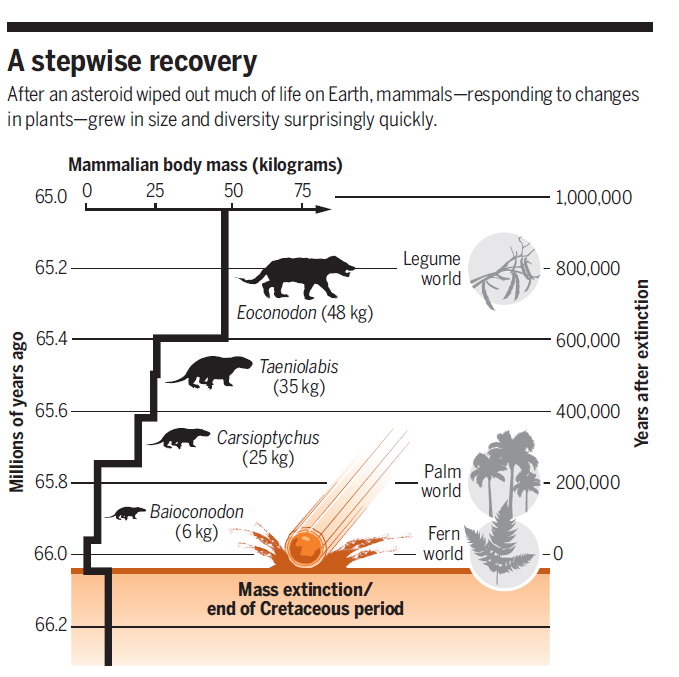 Suite à cette crise des niches écologiques se sont libérées et ont permis aux animaux de petite taille de proliférer, et d’augmenter ensuite progressivement en taille (How life blossomed after the dinosaurs died) . Cela s’explique notamment par la disparition de leurs prédateurs, notamment les dinosaures et autres archosauriens. Dans l'article Therian mammals experience an ecomorphological radiation during the Late Cretaceous and selective extinction at the K–Pg boundary, Grossnickle et al. décrivent 3 types principaux d'extinction : la première, l'hypothèse de la suppression est celle soutenue par les articles cités précédemment, la seconde est une extinction adaptative qui favorise certains morphotypes, et la dernière est l'extinction non-adaptative. Selon eux la radiation des mammifères s'est produite bien avant la crise K-pg (10 à 20 millions d'année auparavant), mais s'est accélérée rapidement après l'extinction de masse. Ce sont les survivants de l'extinction qui se sont ensuite diversifiés rapidement, profitant de certaines niches écologiques vacantes.
