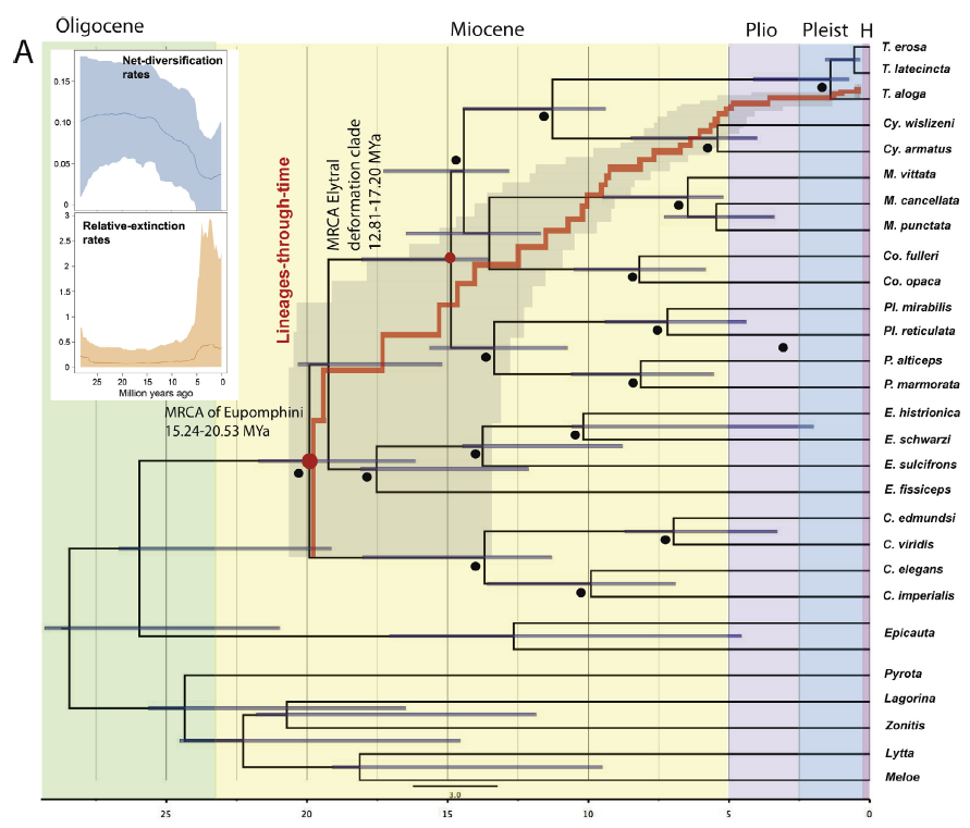 López-Estrada et al. 2019 ont étudié l’impact des extinctions d’arrière plan du Miocène-Pliocène sur la diversité actuelle de coléoptères. Lors de cette transition, la diversité nette a chuté suite à une augmentation des extinctions d’arrière plan, qui seraient liées à l’aridification. On observe au même moment une chute de la diversification. High extinction rates and non-adaptive radiation explains patterns of low diversity and extreme morphological disparity in North American blister beetles (Coleoptera, Meloidae) L'intérêt de cette étude est de voir l'impact des extinctions passées sur la diversité actuelle et sur la disparité morphologique.