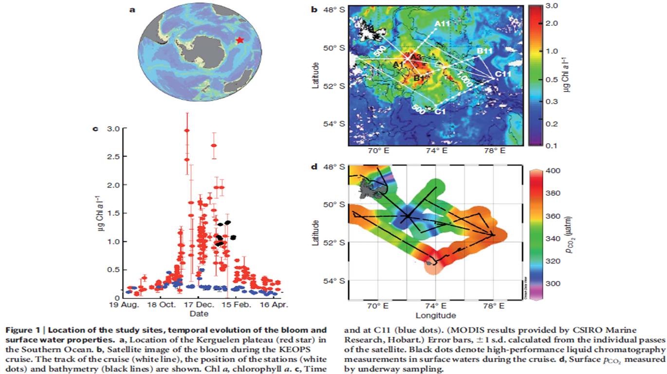 Ces auteurs ont trouvé qu'un grand bloom de phytoplancton à la surface des eaux sur le plateau de Kerguelen dans l'océan Austral était soutenu par l’approvisionnement en fer et les nutriments principaux depuis des eaux profondes riches en fer.