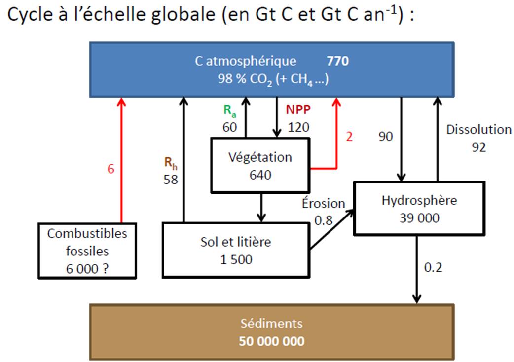L'augmentation de la concentration du CO2 dans l'atmosphère terrestre est l'un des facteurs d'impact à l'origine du récent réchauffement climatique, effectivement, ce gaz est intimement lié aux variations de températures : les gaz à effets de serre en bloquant les rayons infrarouges augmentent la température terrestre, ce qui entraîne la fonte des glaciers et l’augmentation de la décomposition dans les tourbières. Le carbone contenu dans ces compartiments est alors relâché.