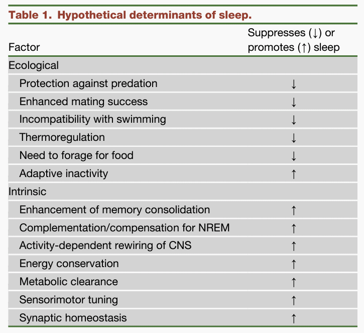 Plusieurs théories ont été proposées pour tenter d'expliquer la sélection évolutive originelle du sommeil . On peut citer notamment une fonction servant les défenses immunitaires, une réduction de l'utilisation de l'énergie à des moments précis, une restauration des stocks d'énergie cérébral ou encore une fonction de purge des toxines du cerveau (Krueger et al., 2015).