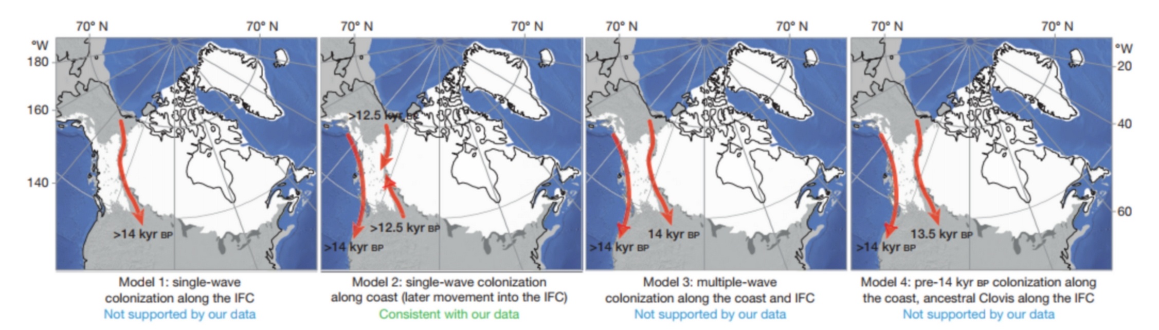 Des études basées sur des données paléo-environnementales ont permis d’estimer la viabilité de différentes voies migratoires et soutiennent ce scénario. En pleine ère glaciaire, l’Amérique du Nord n’était pas franchissable il y a 14 000 ans. Compte tenu de la datation des données archéologiques, des migrations auraient donc eu lieux avant cette période. Puis l’ouverture, il y a près de 12 000 ans, d’un corridor entre deux calottes glaciaires aurait permis une seconde phase de migration vers le Sud, mais également des flux de gènes entre les populations du Sud et celles du Nord, alors réunies par cette voie migratoire viable. [11] [5]