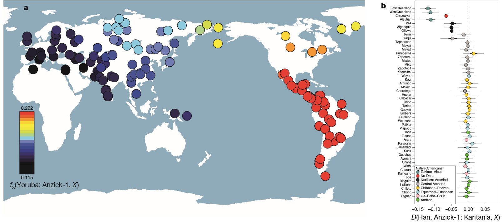 Une principale migration serait survenue entre 20 et 25 000 ans avant aujourd'hui, de la Sibérie à l'Amérique du Nord par la Béringie, suivie d'une seconde phase plus récente entre 13 000 et 11 300 ans de migration interne à l'Amérique. La diversité génétique aujourd'hui observable chez certains groupes ethniques (Eskimo, Da-nene) serait explicable par des migrations et flux de gènes intracontinentaux liés au contexte climatique (périodes glaciaires). [9] [10]