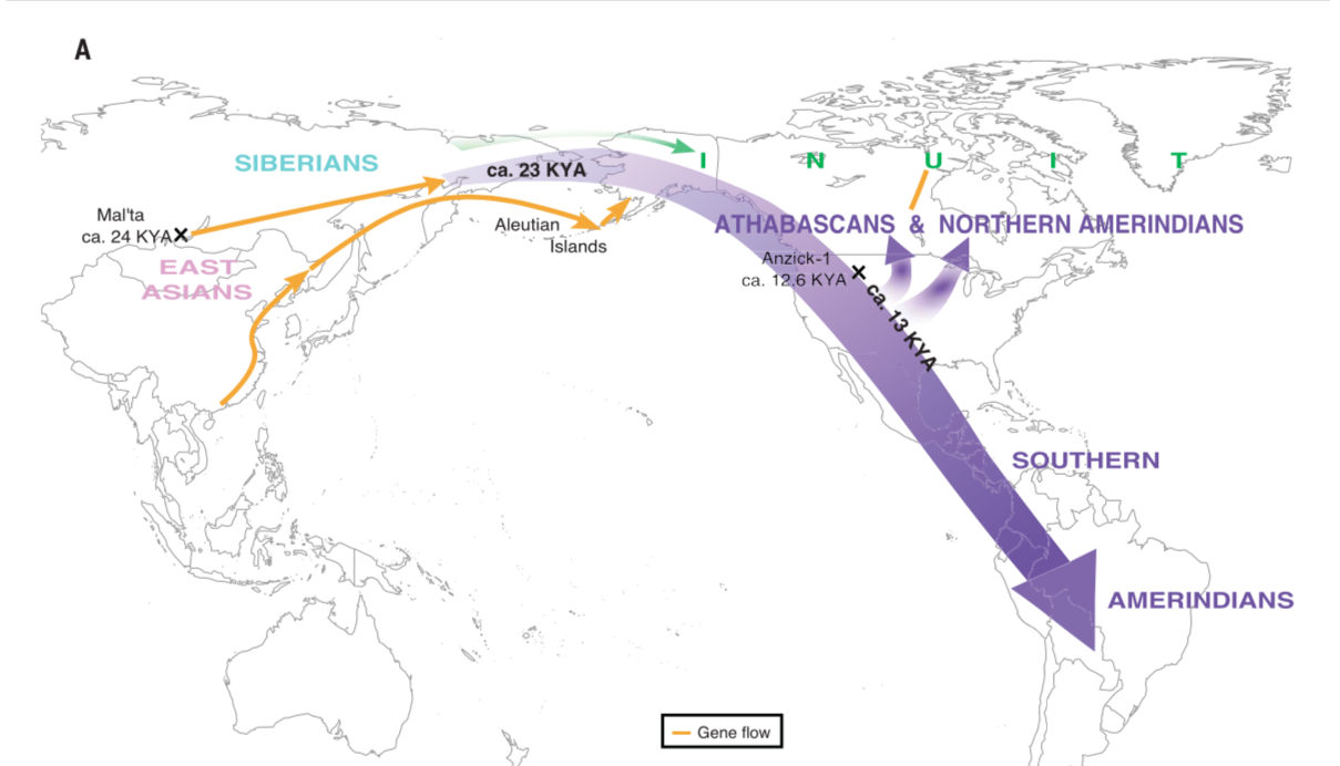 Certains travaux basés sur des analyses génétiques avancent qu’une partie de la population ayant migré à travers la Béringie serait originaire du Nord de l’Asie, et que seraient survenus plus tardivement des flux de gènes avec le Nord de la Chine [2].