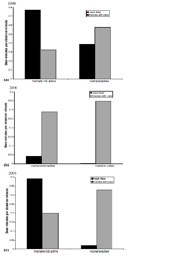 On observe dans la majorité des cas une réponse négative de l’écotourisme sur la biodiversité (augmentation du stress[20], modifications du temps alloué aux activités[17]…). Il est difficile cependant de déterminer si ces modifications auront un impact sur la viabilité des populations. Certaines études ont toutefois observées des réponses positives : l’écotourisme augmenterait la taille de population et diminuerait le risque d’extinction de populations d’animaux charismatiques (orang-outang, guépard)[2]. Egalement, la présence humaine peut servir de « bouclier » pour les proies contre les prédateurs[21], ou pour les ours femelles contre les mâles agressifs[11].