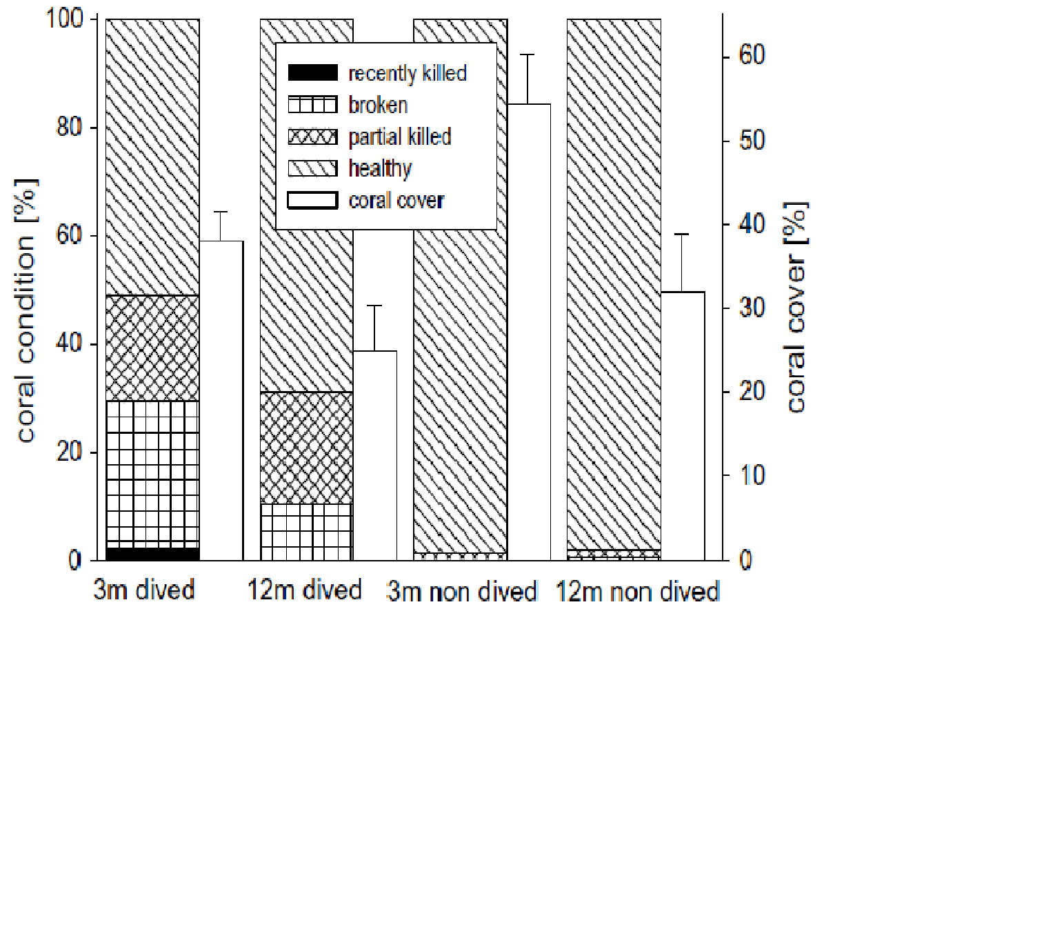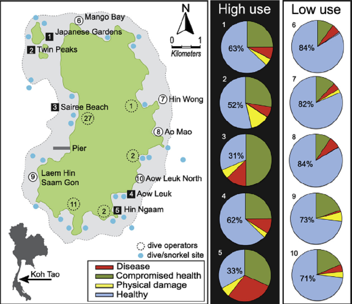 En ce qui concerne les autres taxons étudiés, le nombre d'études est assez restreinte[1]. Pour les reptiles, un seul représentant a beaucoup été étudié : l'iguane. Ces études ne concordent pas toutes dans le même sens en fonction de ce qui a été observé. L'écotourisme impacte le stress des iguanes[12] toutefois, cela ne semble pas influencer leur survie[13] [12] mais au contraire augmenter leur croissance du à une alimentation apportée par l'homme. Cette dernière doit être contrôlée pour éviter que les iguanes souffrent de problèmes digestifs[14]. Concernant les milieux marins quelque études ont essayé de caractériser l'impact possible de l'écotourisme sur ce milieu d'étude qui est difficile d'observer. Malgré ces difficultés, des études ont pu montrer des changements de comportements chez des mammifères marins et des poissons[15] [16] [17]. Les coraux étant des organismes immobiles il a beaucoup été étudié l'impact de l'écotourisme sur ces espèces. Des études[18] [19] ont mis en évidence que les plongeurs impactaient fortement les récifs coralliens en les rendant plus vulnérables physiquement et face aux maladies.