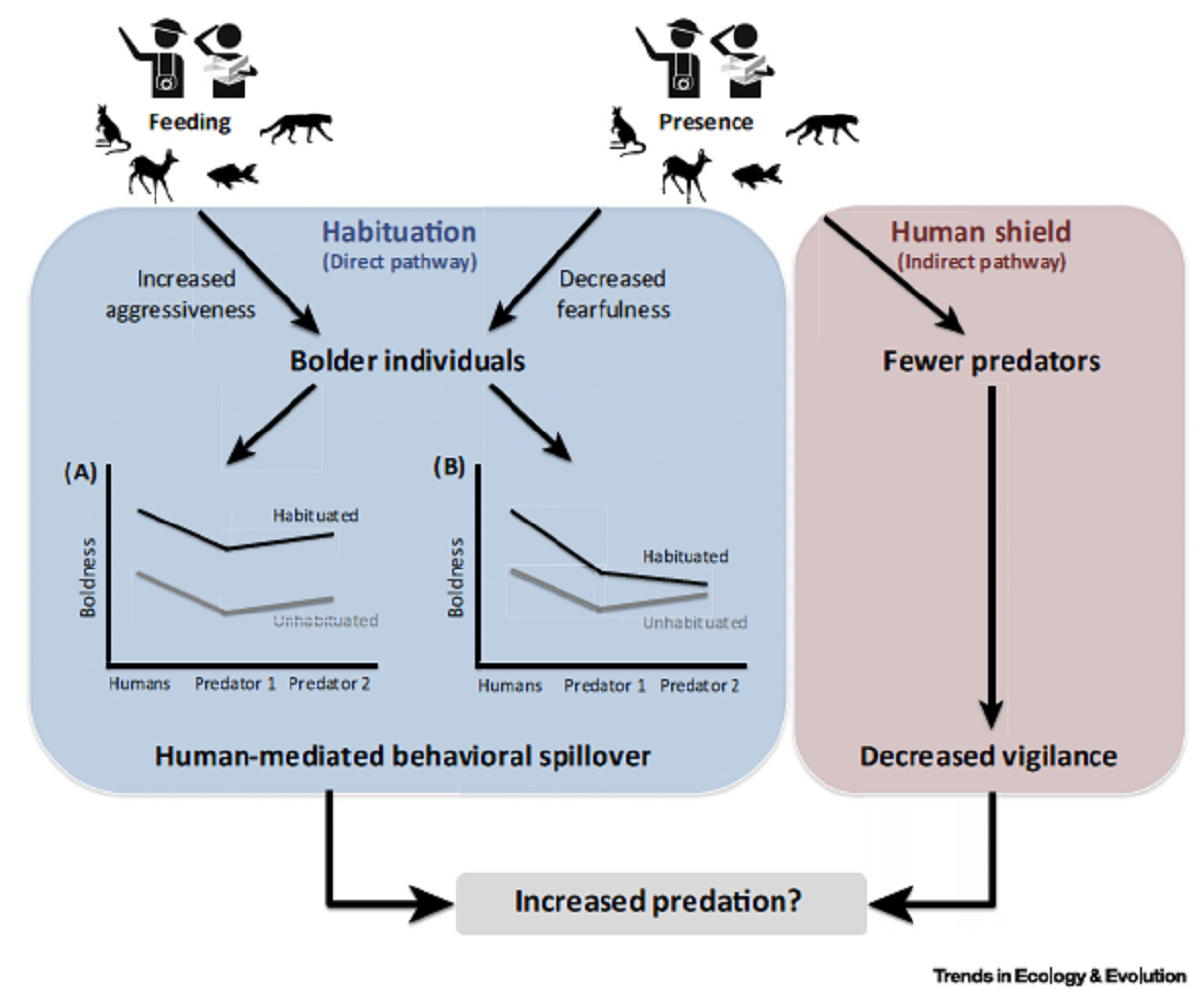 L'écotourisme peut aussi être vu comme un changement environnemental qui favoriserait les individus les plus adaptés à la cohabitation et aux interactions avec l'homme. En effet, au niveau intra-spécifique, des différences individuelles de comportement envers les humains sont observées : les "timides" (shy/reactive) fuyant et évitant les contacts avec les humains, et les "audacieux" (bold/tame) acceptant la présence humaine. Worrell (2017) a proposé un modèle de réponse des individus timides et audacieux à des phénomènes d'écotourisme. Tout d'abord, ces individus vont s'organiser de manière spatiale : les individus les plus timides vont fuir les endroits où les touristes sont présents et les individus les plus audacieux vont coloniser ces endroits. Toutefois, ceci est possible seulement lorsque des habitats alternatifs sont disponibles où les individus timides puissent accéder. Autrement, nous pouvons supposer que les individus les plus timides aient une moins grande survie et fécondité, puisqu'ils passent plus de temps à fuir et à être vigilant qu'à chercher de la nourriture ou s'occuper de leur progéniture par rapport aux individus audacieux. Ainsi, l'écotourisme favoriserait les individus les plus compatibles à l'écotourisme ce qui induirait une sélection des individus audacieux et une diminution des individus timides, alors contre-sélectionnés. Ceci est toutefois à remettre en perspective, puisqu'une habituation des individus aux interactions humaines induirait également une augmentation de la vulnérabilité des proies envers les prédateurs[21].