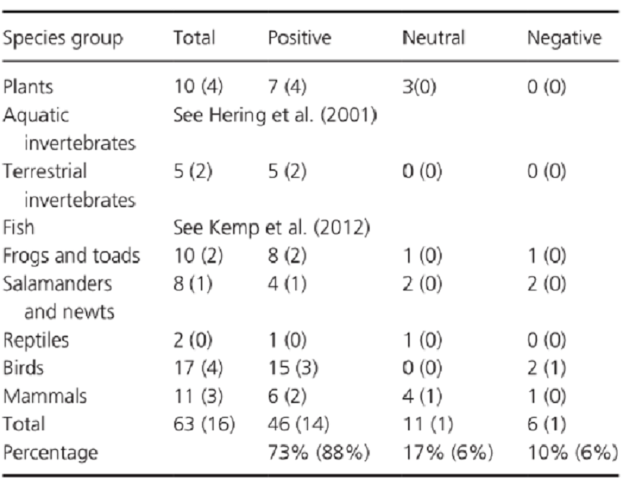 Cet ingénieur écosystémique favorise l'implantation et le développement d’espèces végétales comme le saule et l’aulne, et d’espèces animales diverses, tels certains amphibiens, oiseaux et invertébrés (Rossel, F. et al., 2005) qui survivent mieux dans une zone humide fertile. L’hétérogénéité d’habitat créée permet à la fois d’augmenter la richesse spécifique de ces organismes et de modifier la composition en espèces de l’écosystème (Law, A. et al., 2017).