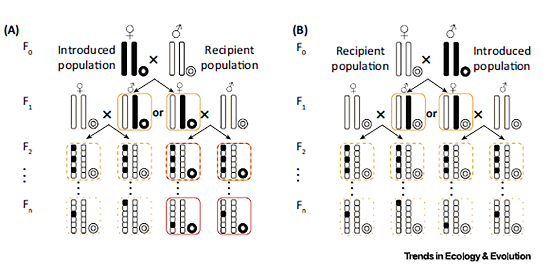 Le but du sauvetage génétique est d’assurer la survie d’une population en en améliorant la croissance et la démographie, qui vont être impactées différentiellement selon le sexe et le nombre d’individus introduits. Une immigration trop importante peut entraîner la dilution des gènes adaptés des individus résidents (gene swamping) (Whiteley et al., 2015) et donc conduire à une population maladaptée à son milieu. Le sexe des individus introduit a également son importance puisque que l’introduction d’un mâle va permettre la fécondation de nombreuses femelles tandis que l’introduction d’une femelle n'apporte que quelques individus de plus à la population.