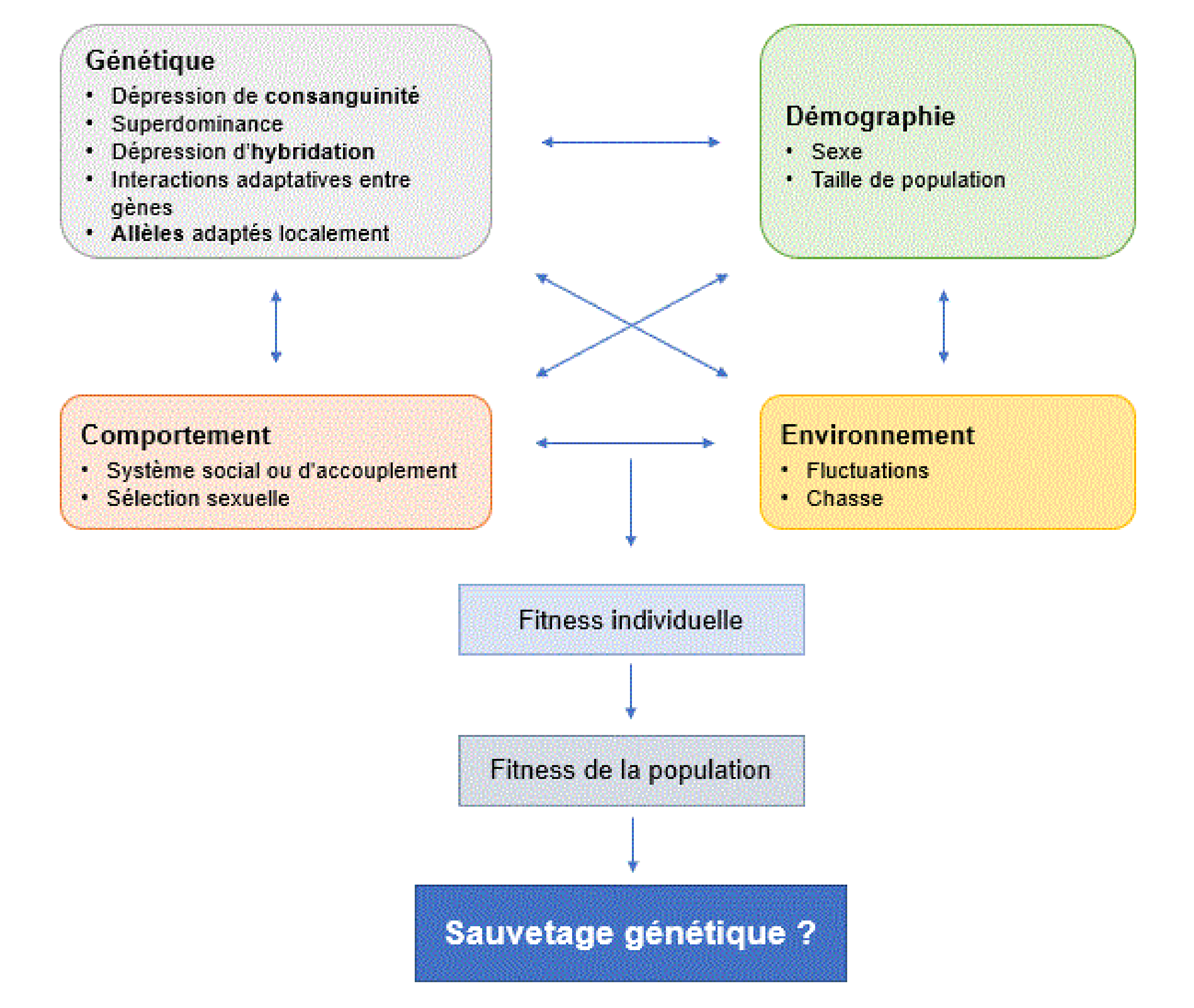 Pour conclure, bien que les effets bénéfiques du sauvetage génétique dans certaines populations soient indéniables, cette pratique n’a pas été assez étudiée notamment au niveau de ses effets sur le long terme, de sorte que ses avantages globaux dans les populations sont toujours méconnus. Il est donc impossible d’affirmer que le sauvetage génétique est une solution à long terme pour tous les cas de figure. Il s’agit d’une méthode qui doit être utilisée avec prudence et considération d’un grand nombre de paramètres (mécanismes génétiques, démographie, environnement, écologie et comportement; voir Figure) (Bell et al., 2019). Il est également important d’évaluer l’impact des individus introduits sur les autres espèces de l’écosystème, pour ne pas déséquilibrer complètement le réseau trophique et menacer d’autres populations de la communauté (Blanchet et al., 2008). Certains auteurs proposent d'élaborer une théorie générale de cette pratique, qui permettrait d'élucider plus clairement les effets du sauvetage génétique sur le** long terme** (Tallmon et al., 2004) dans la perspective de proposer des directives pour guider au mieux les opérations de réintroduction en biologie de la conservation.