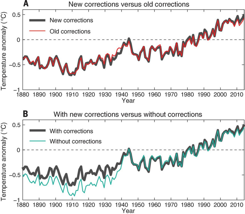 En 2015 enfin, un article passe en revue les données utilisées par le GIEC pour leur rapport de 2013, et démontre la présence d'artéfacts liés à l'évolution technologique des appareils de mesure. D'après ses auteurs, la correction des données par des coefficients adaptés permettant de gommer les effets du changement technologique dans les mesures fait disparaître cette supposée "pause" (1998-2012).[5]