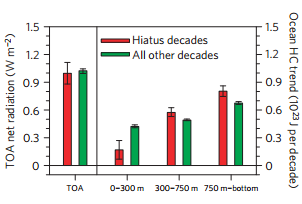 Avant eux pourtant, dès 2011, une autre étude utilisant des modèles informatiques avait montré que le réchauffement des eaux ne s'interrompait pas, mais se déplaçait des couches de surface vers des couches plus profondes[2]. Comme les mesures sont en général faites à la surface des océans, pour des raisons pratiques, celles-ci semblent donc prouver l’existence de pauses dans le réchauffement climatique. Deux autres études confirment cette hypothèse en 2014 et 2015[3][4].